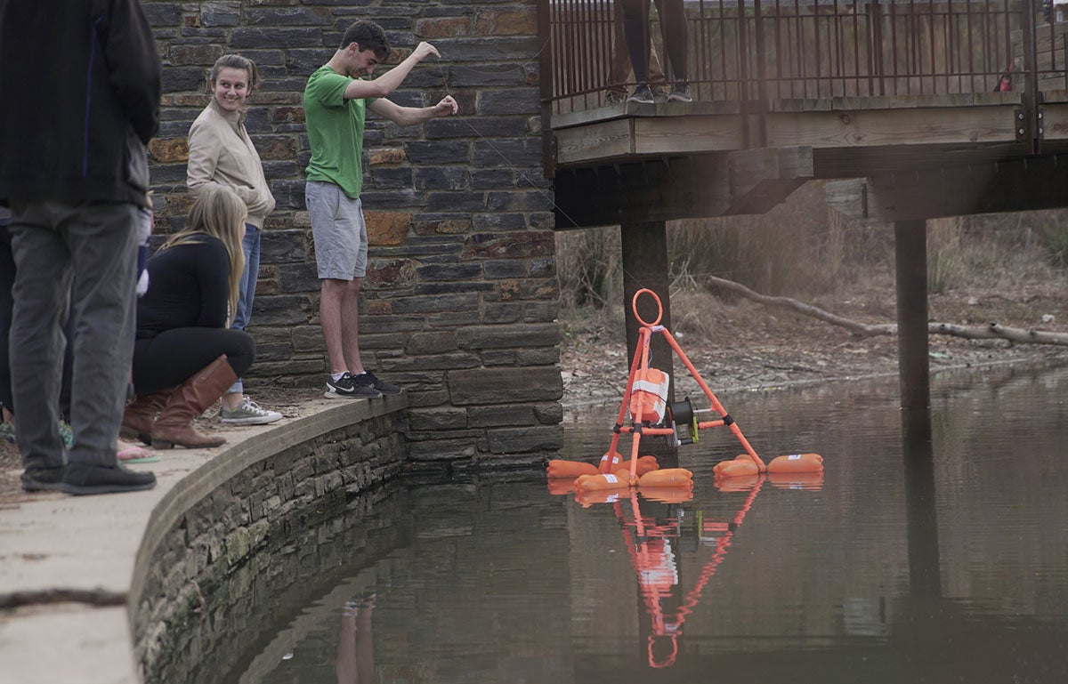 During the XPRIZE visit to Duke, we had a number of tests to pass the criterion for completion of Round 1; one was that our large heavy lift drone had to exceed 25 miles per hour. The test went off OK with the drone reaching 36 mph. However, we had another drone up to film the test flight that unfortunately interfered with our radio control link, so the competition drone kept on flying into the woods of Duke Forest after the test. It came to rest after a lot of crashing and banging, and surprisingly, was still in one piece!